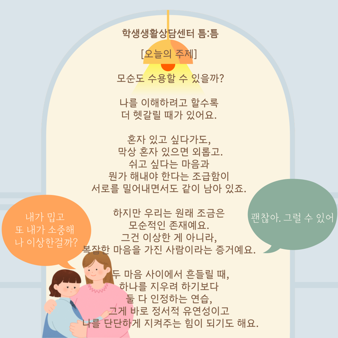 가끔은 자신이 너무 밉다가도 또 자신을 아껴주는 순간이 누구나 있기 마련인 것 같아요. 스스로를 모순적으로 대하는 순간에 고통스럽다는 마음이 들때도 있지만, 이상한 현상이라고 생각하지 않고 두 가지 생각과 모습 모두 내 모습이라고 받아들이는 태도가 중요하다고 생각해요. 앞으로도 두 마음이 서로 모순될 때에는 스스로 받아들일 수 있도록 더 노력해야할 것 같아요.