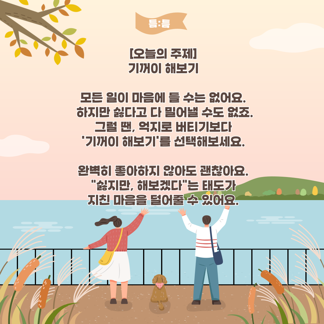 오늘의 생각거리를 보고 한참 생각했습니다. 저는 최근 팀플 조장 역할을 억지로 하고 있었습니다. 아무도 나서지 않는 일을 맡아 이끌어가려니 솔직히 스트레스가 많았습니다. 완벽해야 한다는 생각 대신, 싫지만 해보겠다는 태도도 괜찮다는 말이 큰 위로가 됩니다. 완벽하진 않지만, 기꺼이 해볼 수 있는 일은... 바로 이 팀플을 무사히 마치는 것 그 자체인 것 같습니다. 억지로 한다고 생각할 땐 끝없는 부담이었는데, 기꺼이 해본다고 마음을 바꾸니 조금은 가벼워지는 기분입니다.