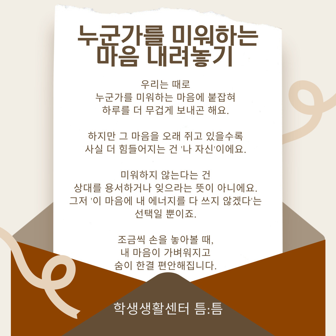 '조금씩 손을 놓아볼 때, 내 마음이 가벼워지고 숨이 한결 편안해집니다'라는 문구가 공감 되네요. 저도 미워하는 감정은 결국 나를 더 힘들게 만드는 방법이라고 생각해요. 그 감정을 억지로 없애기보다 받아들이고, 그 에너지를 나를 돌보는 데 쓰면 더 편안하고 건강하게 지낼 수 있을 것 같습니다.