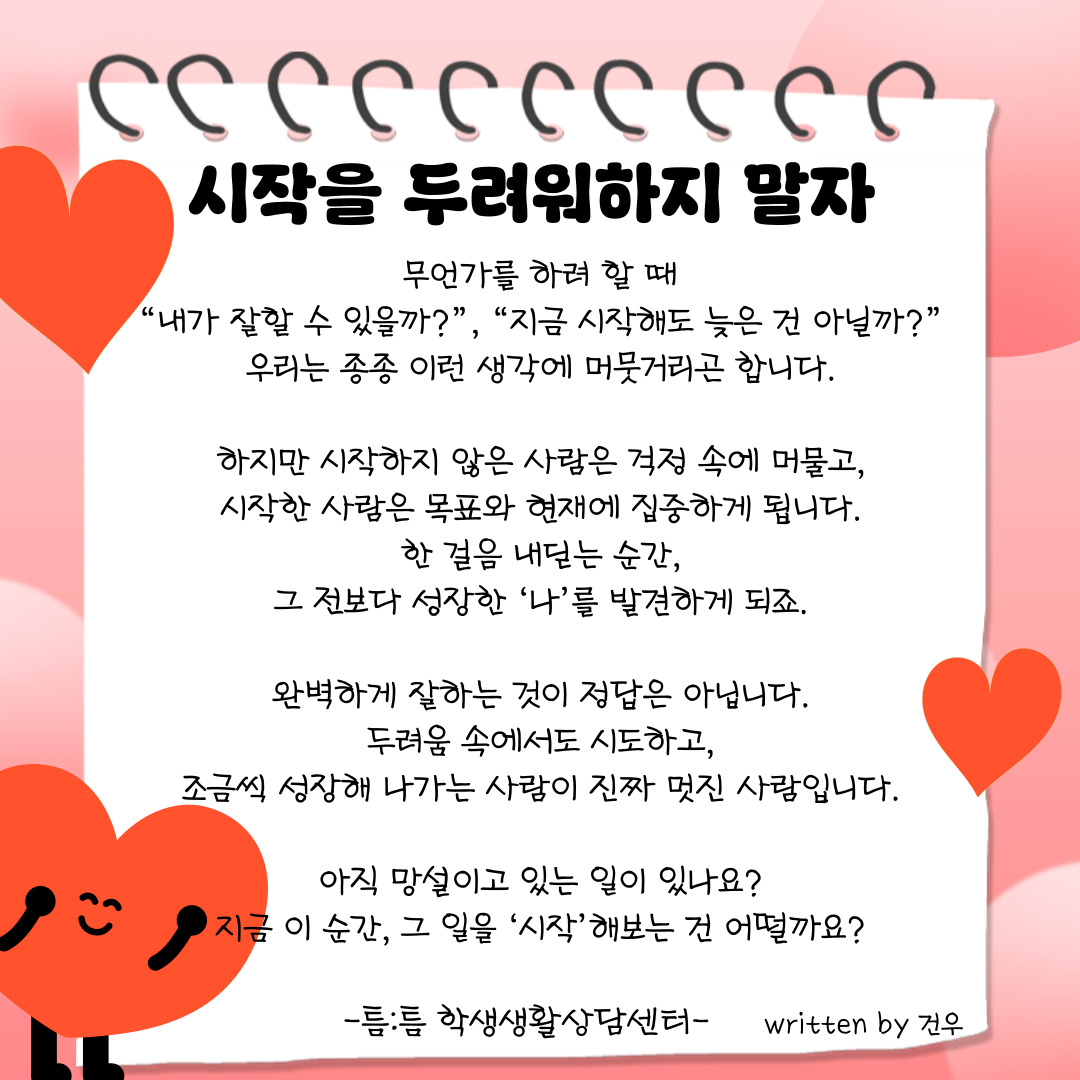 예전엔 시작이 설레는 일이었는데, 어느새 두려운 일이 되어버렸습니다. 잘 모르는 분야에 도전하려 하면 ‘내가 과연 할 수 있을까’라는 걱정이 앞서곤 해요. 하지만 그 두려움 때문에 아무것도 하지 않으면, 결국 제 가능성도 멈춰버린다는 걸 느꼈습니다. 그래서 저는 다시 한 번 초심으로 돌아가 “시작을 두려워하지 말자”는 말을 스스로에게 건넵니다. 작은 한 걸음이더라도, 그게 분명 제 성장의 시작이 될 거라 믿습니다.