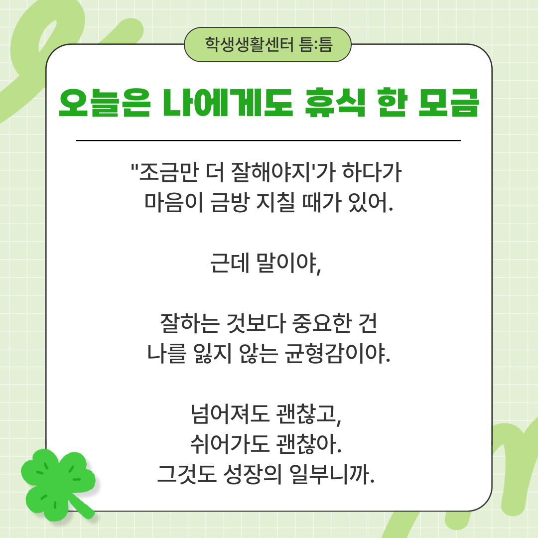 저는 '잘하려고' 더 애쓰고 있는 것 같습니다. 더 좋은 곳에 취업하고, 앞으로 더 나은 삶을 살기 위해서는 지금 현재의 노력이 가장 중요하다고 생각하기 때문입니다. 물론 글에서처럼 '조금만 더 잘해야지' 하다가 마음이 지칠 때도 있지만, 그럴 때마다 '나를 잃지 않는 균형감'을 가지려고 노력합니다. 넘어져도 괜찮다는 위로와 휴식의 중요성을 일깨워주셔서 감사합니다. 오늘 글을 보니, 그렇게 열심히 애쓰는 과정에서도 '휴식 한 모금'을 챙기며 저 자신을 잃지 않는 것이 진정한 성장의 일부임을 다시한번 깨닫습니다. 좋은 글 감사합니다!
